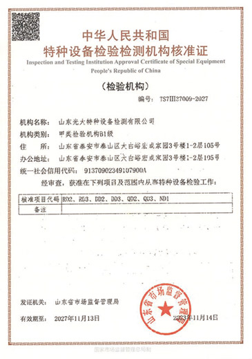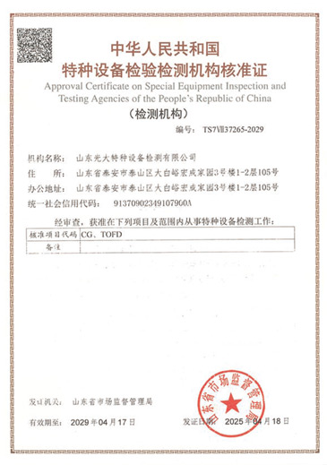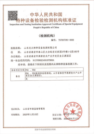 山東光大特種設(shè)備檢測(cè)有限公司是經(jīng)山東省市場(chǎng)監(jiān)督管理局核準(zhǔn)的甲類B1特種設(shè)備綜合檢驗(yàn)機(jī)構(gòu)。2017年9月30日取得了山東省市場(chǎng)監(jiān)督管理局頒發(fā)的《檢驗(yàn)檢測(cè)機(jī)構(gòu)資質(zhì)認(rèn)定證書(shū)》。2018年2月22日取得了山東省市場(chǎng)監(jiān)督管理局頒發(fā)的《特種設(shè)備檢驗(yàn)檢測(cè)機(jī)構(gòu)核準(zhǔn)證》(起重機(jī)械)檢驗(yàn)檢測(cè)資質(zhì)。2021年11月取得山東省市場(chǎng)監(jiān)督管理局版發(fā)的《特種設(shè)備檢驗(yàn)檢測(cè)機(jī)構(gòu)核準(zhǔn)證》(安全閥在線、離線)校驗(yàn)資質(zhì)。2023年11月取得山東省市場(chǎng)監(jiān)督管理局頒發(fā)的甲類檢驗(yàn)機(jī)構(gòu)B1《特種設(shè)備檢驗(yàn)檢測(cè)機(jī)構(gòu)核準(zhǔn)證》,具有壓力容器(RD2...